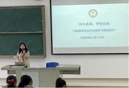 12月10日,附属口腔医院正畸科柳汀博士在7601为2021级全体同学进行了主题为夯实基础,梦想起航”的宣讲培养大一新生掌握医学基础课程的正确学习观念。