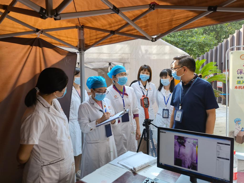 调研团队走访了预检分诊点、临床各科室、综合诊疗区等地。马洪在听取各科室护士长、工作人员相关汇报后,根据上级部门最新指示,就医院开展的疫情防控工作提出强化措施,并对各科室提出了具体要求: