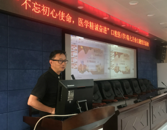 7月25日,口腔医(学)院在行政楼五楼学术报告厅开展了题为“不忘初心使命,医学精诚奋进”的主题党日活动。此次活动由第四教工党支部牵头,贾源源医生主持,全公司党支部共同参与。党委书记张军梅、经理马洪、副经理唐正龙走进支部同全公司党员共同学习。